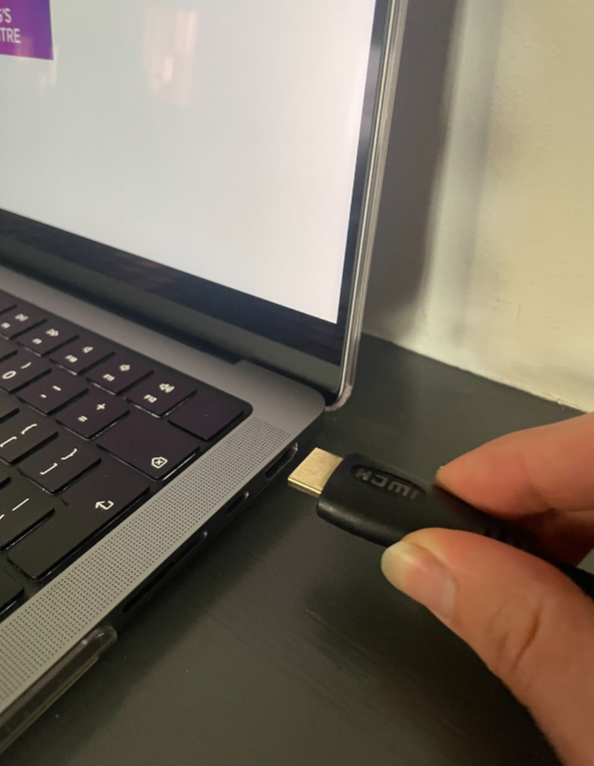 Locate the HDMI cable at the front of the room. Make sure one end is securely in the port of the black box on the front wall. Take the other end and put it in the HDMI port of your computer.