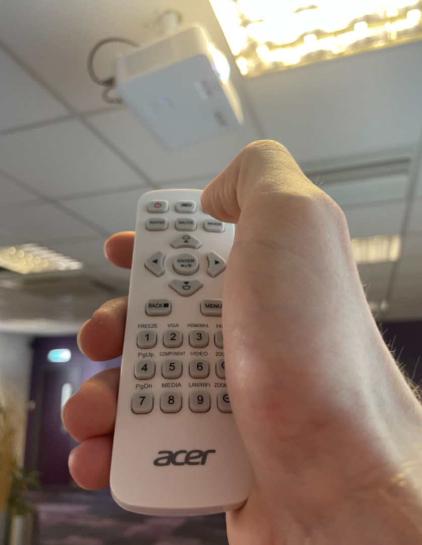 Using the remote provided, point it towards the projector and switch on.