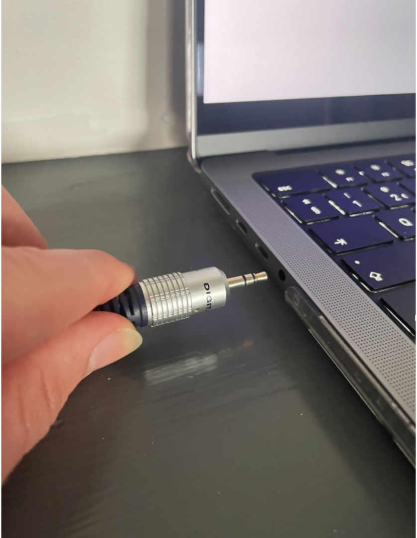 Sound is received through a separate headphone cable that runs from the black DVD player located at the front right of the room. Take the end of the cable and plug it into the headphone port of your computer.